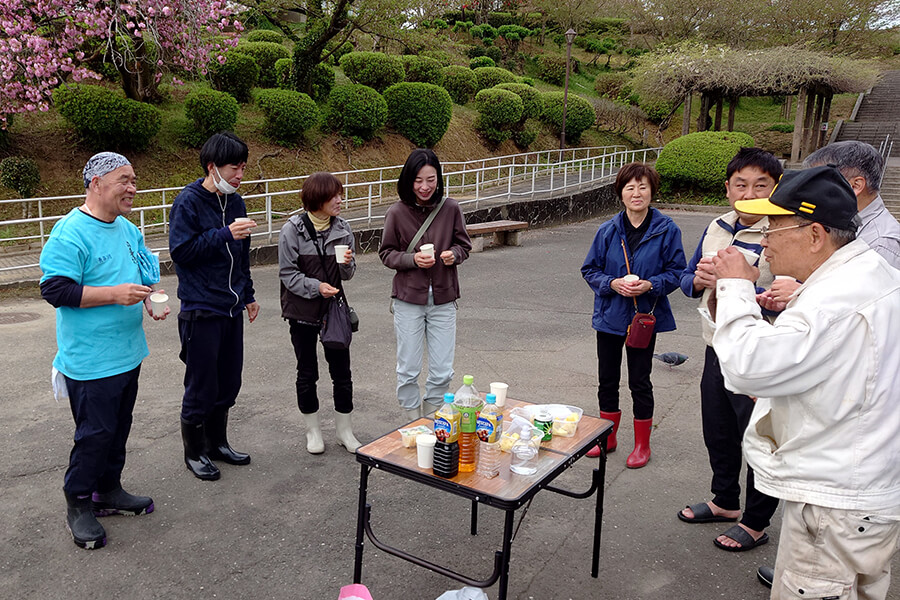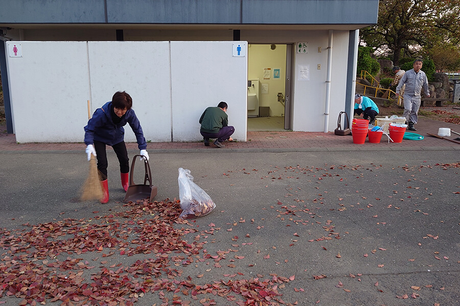 先週まで花見で大賑わいした桜も既に散ってしまい、柔らかな新芽が出始めている中、落ち葉を集める掃除から開始です。