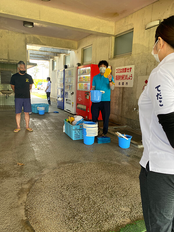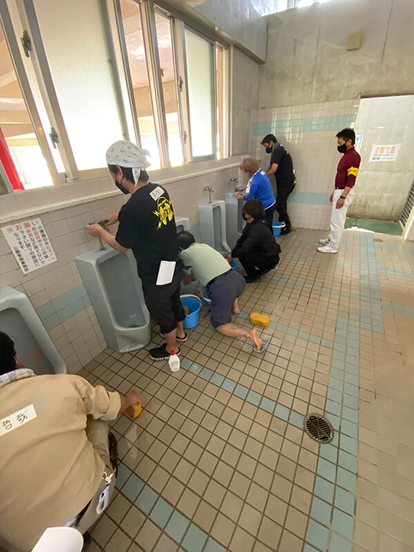 参加者総勢28名で、名護市の「21世紀の森公園」でビーチを目の前に久しぶりに南部・中部・北部のメンバーを交えてトイレ掃除を行いました。
