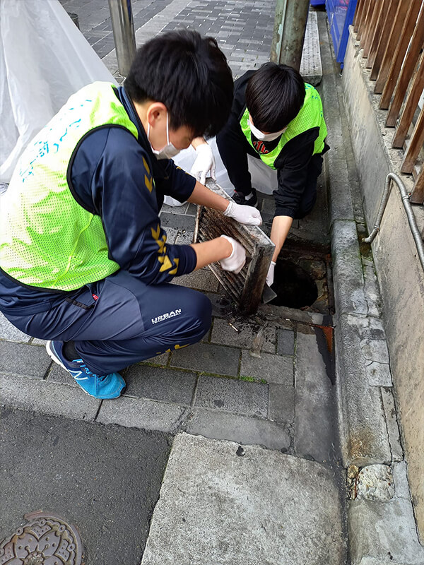 梅雨入りを前に、伸びてきた草刈り、グレーチングの掃除、植え込みのゴミ拾いを三班に分かれて行いました。