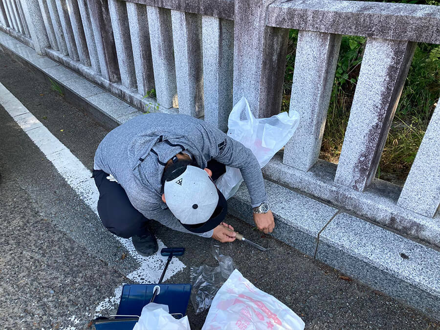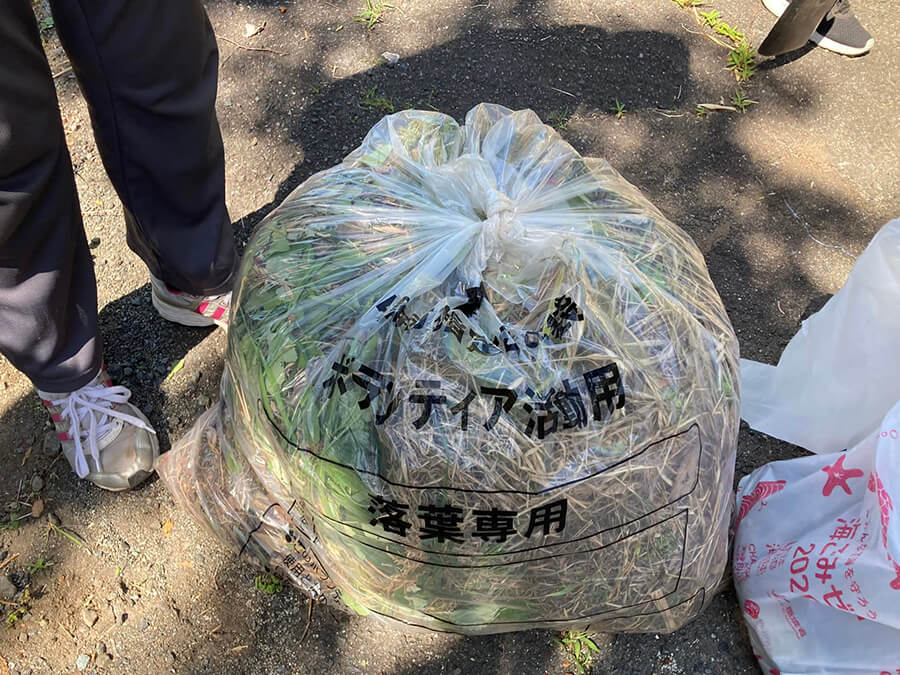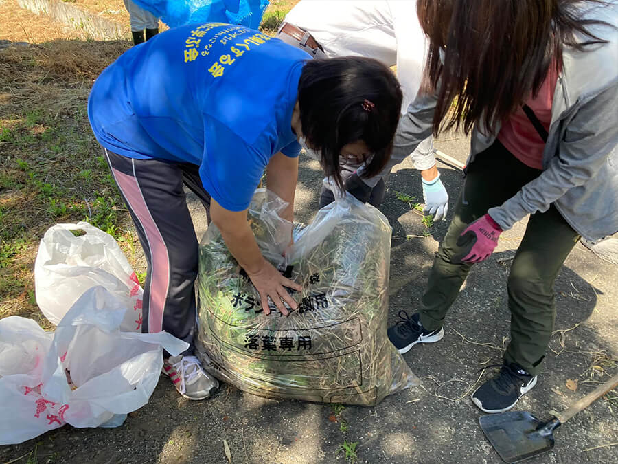 - 集合場所から500メートル先4方へ4班に分かれて、周辺道路沿いの雑草除去や砂掃き、即行の土取りを行いました。特に雑草が多く、45リットルのゴミ袋50袋分を回収しました。