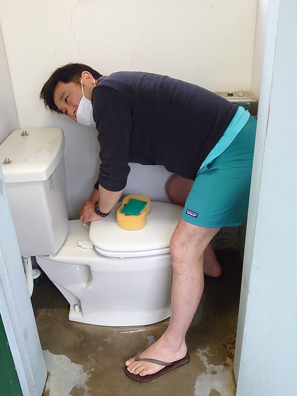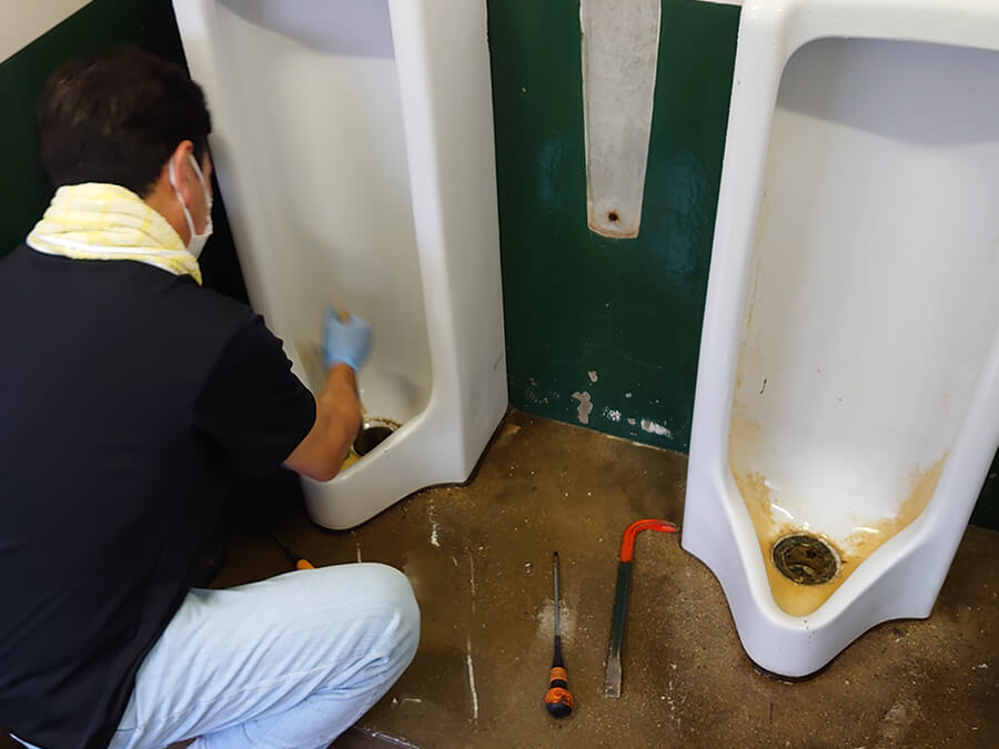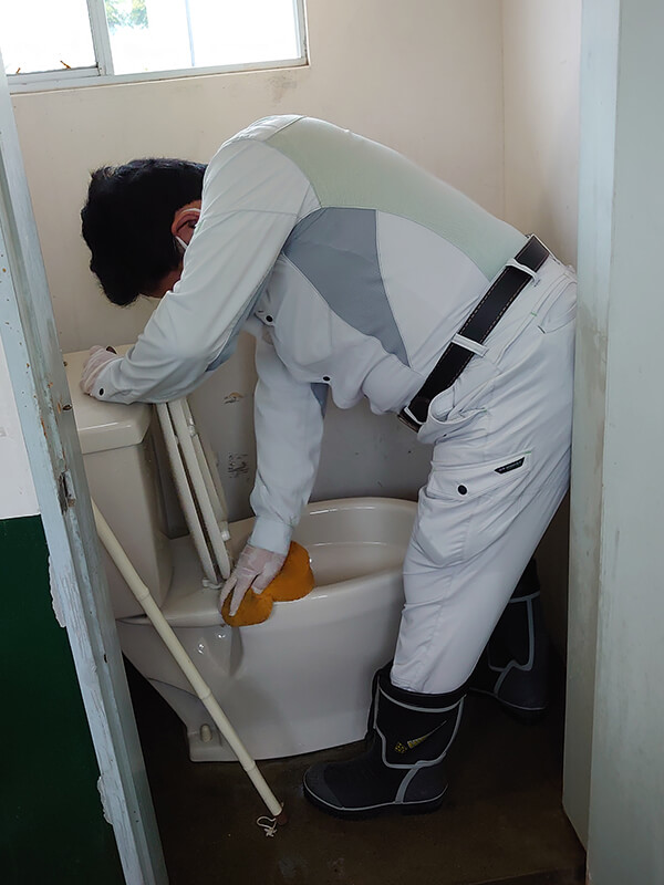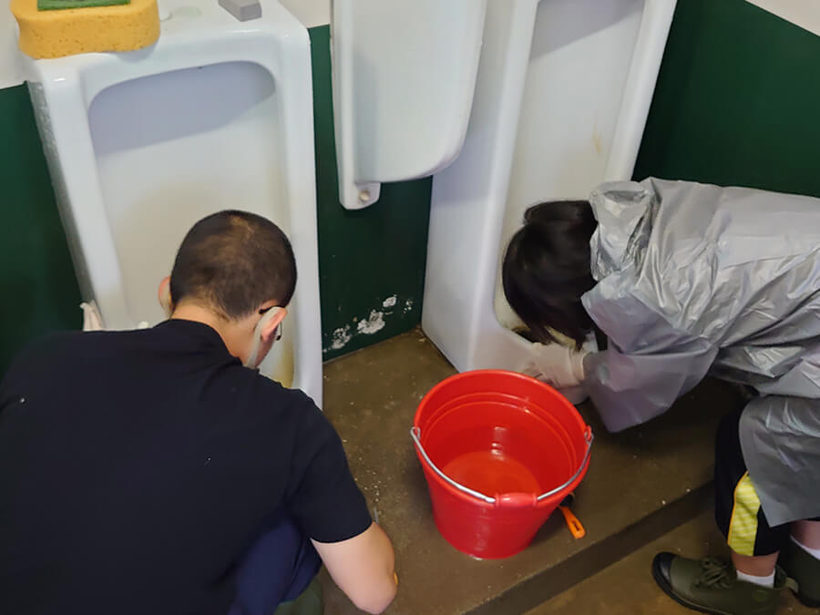トイレ掃除のベテランでも躊躇するような小便器でしたが、和白丘中の二人は、ガッツリ便器に向き合ってドライバーで尿石の塊を取り、軽石で黄ばみをこすり落としてくれました。事前に水洗いしてたっぷり水を含ませた後、軽石で黄ばみをこすると見る見る汚れが落ちていきます。サンドメッシュより軽い力で強烈な黄ばみを簡単に落とすことができましたので、皆さんもお試しください。