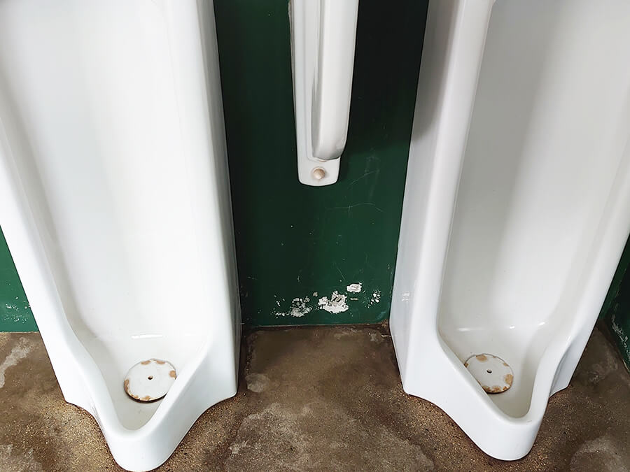 場所はグランド脇にある水洗ではないボットン式の古い公衆トイレで、当然小便器には洗浄水ボタンが無く、尿石の黄ばみと臭いが強烈でした。