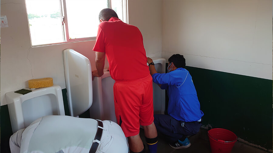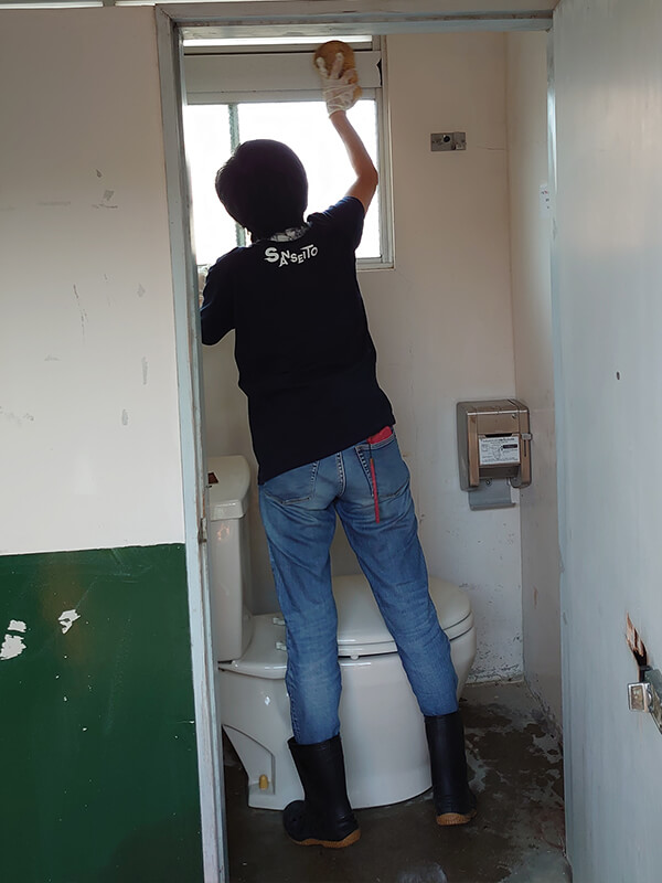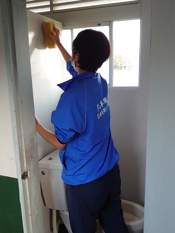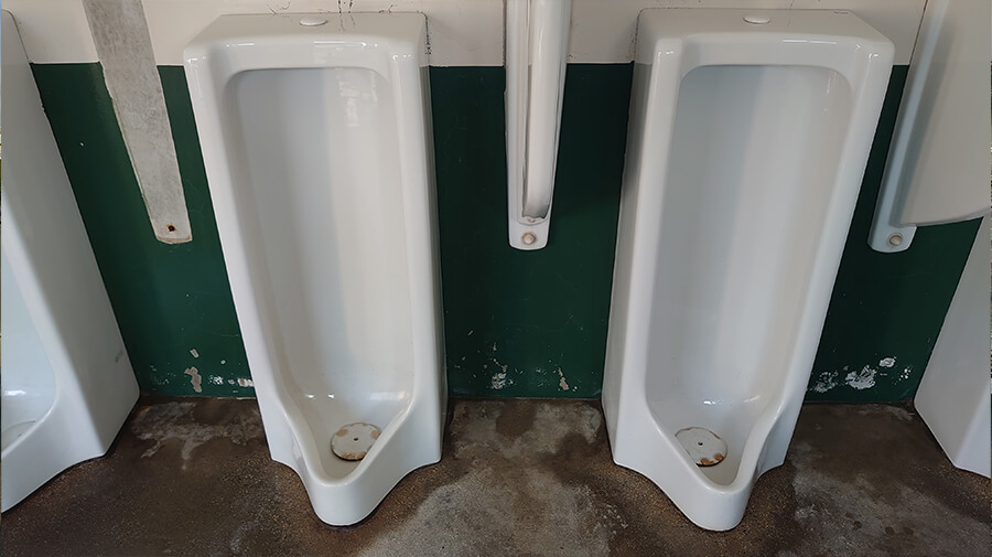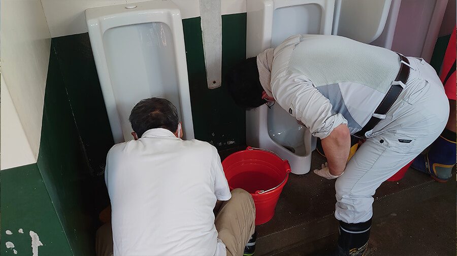 ここの男子トイレは、洗浄装置が付いていないため、尿石のこびりつきがひどいところです。そこで今回の掃除では前日よりクエン酸処理をやっておいたお陰で、黄ばみも完全に落とすことができ、便器全体は真っ白になり、小便器中央の金属部分は金ピカになって美しく輝いていました。