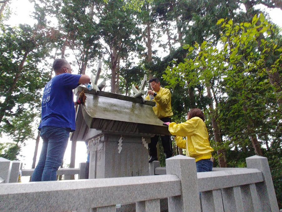 アルカリ電解水で石製の社殿を綺麗にしてきました。前回はできなかったお酒のお供えもしてきました。