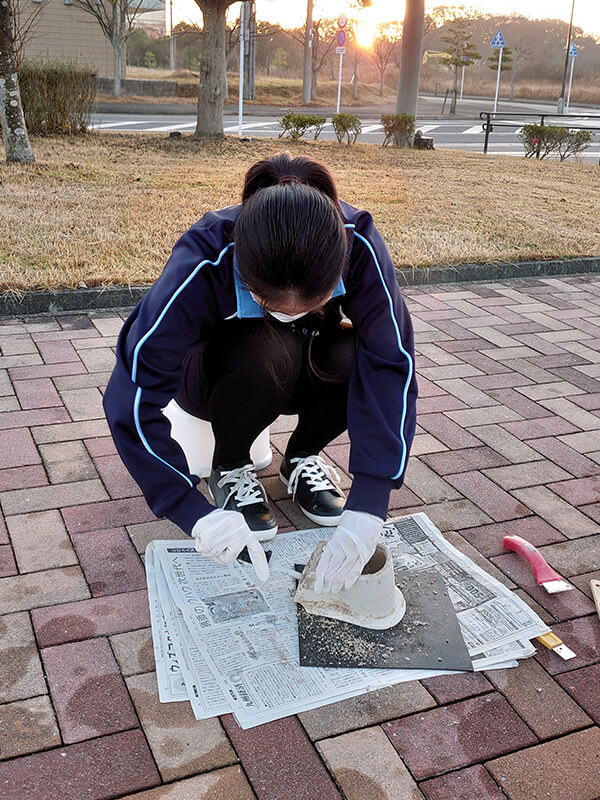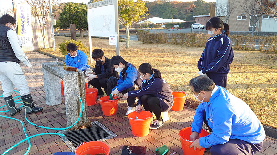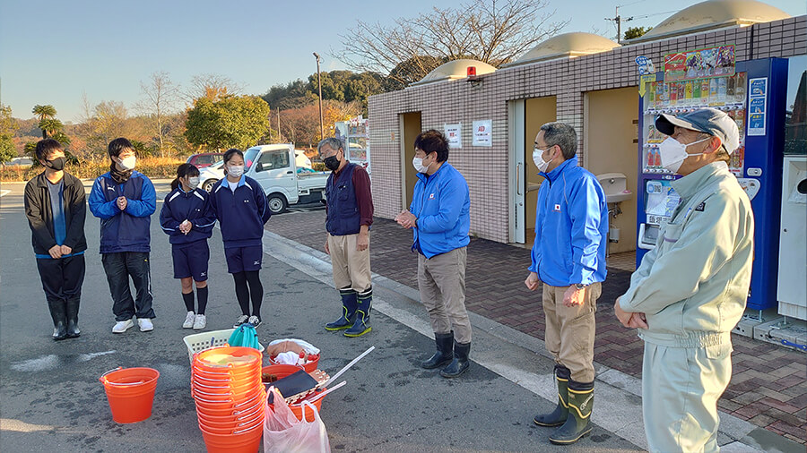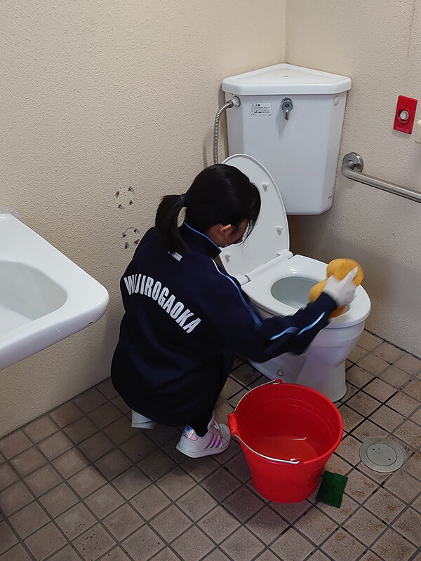 中尾先生と酒井先生が、和白丘中学校の生徒さん6人を連れて一緒に参加くださりましたので、掃除人の皆さんもすごく気合を入れてお手本を示しながら指導してありました。生徒さんたちは初めてのトイレ掃除実践とのことでしたが、どの子も寒さにめげず、熱心に懸命に頑張ってくれました。