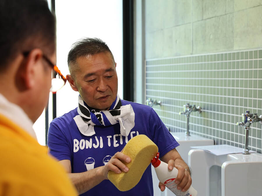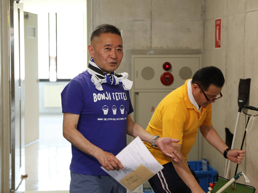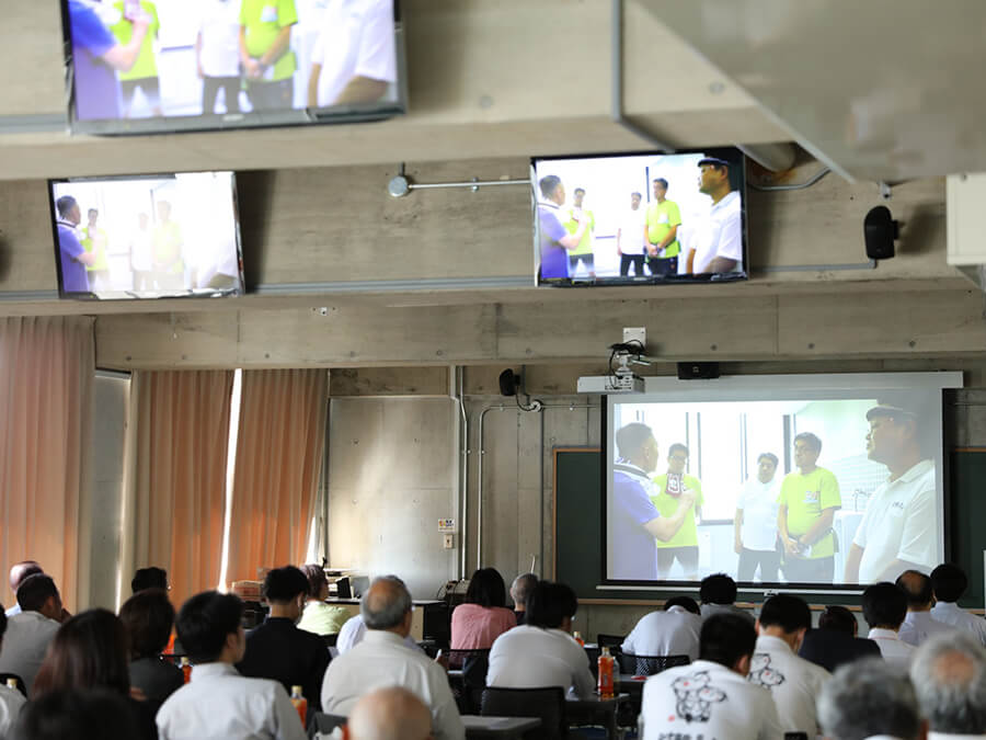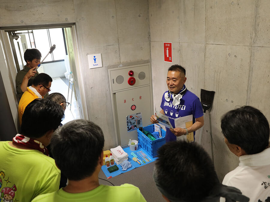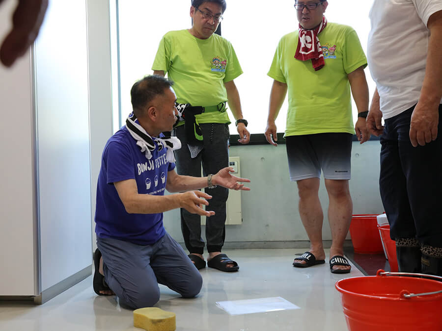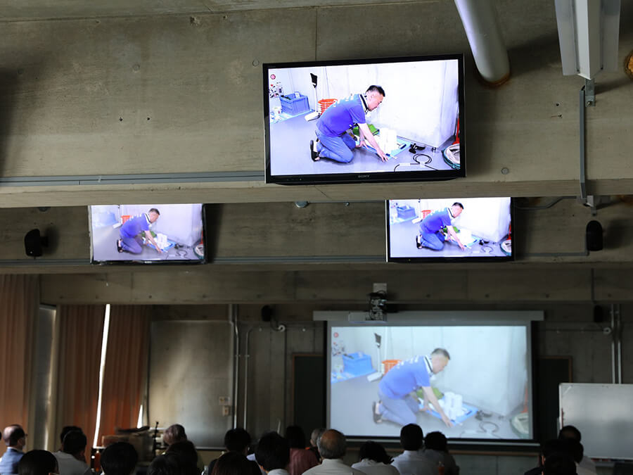 その後代表の5名に掃除実習に入ってもらい、その様子をリモートで研修会場のモニターにつないで見るという形で研修を行いました。