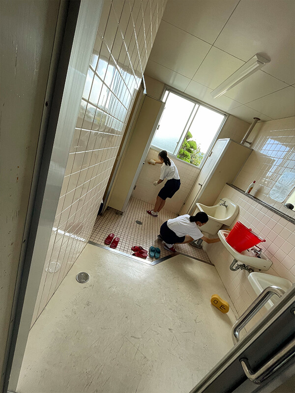 まるでクラブ活動のように自分たちで主体的に進めます。 「この時間じゃ終わらんけー、掃除合宿したいねー」と話しています。 友達に誘われて初めて参加した生徒も一番手強い便器と格闘しています。