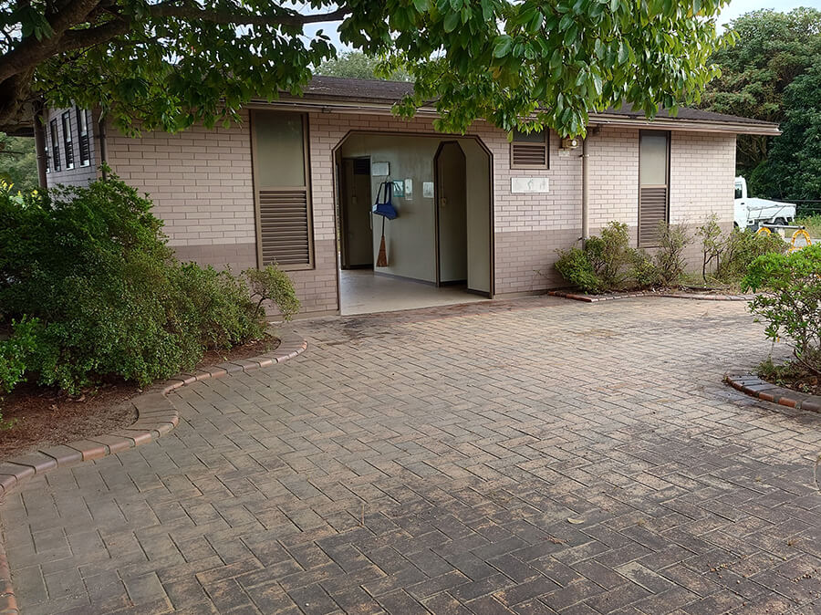 夜明け前の薄暗い中道具を搬入しますと、管理人がいないトイレの周りは雑草等が茂り落ち葉だらけになっていました。
