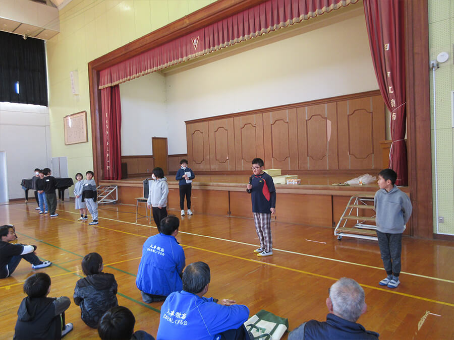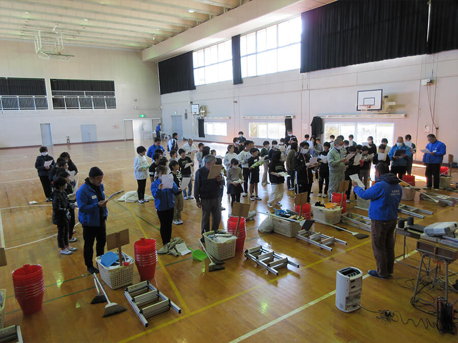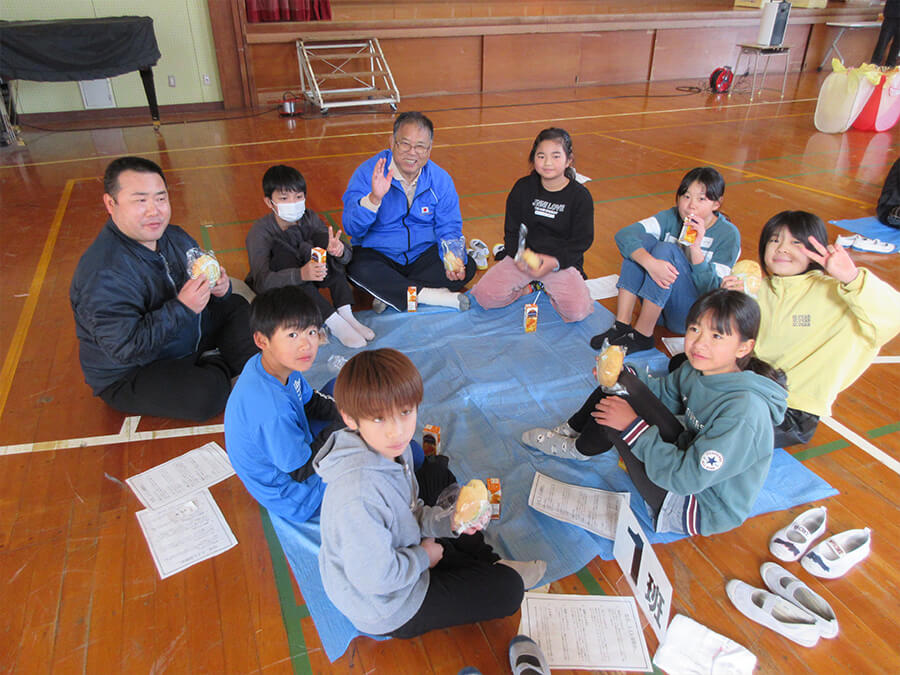 道具を洗って分別回収した後は体育館に集まって、パンとジュースによる昼食交流会です。開会式と比べてどの子もやり終えた満足感から気持ちがハイになりとても賑やかです。最後の感想発表では、「最初は嫌だったけど、やってみたらドンドン綺麗になるので楽しかった」と笑顔で発表が続き、場の雰囲気も和み温かくなっていました。
