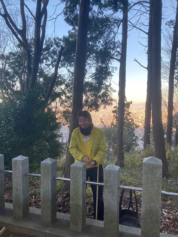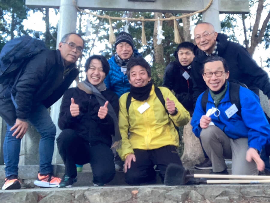 生駒山のハイキングコースにもなる山登り、ペットボトルに水、お掃除道具を背負って向かいます。