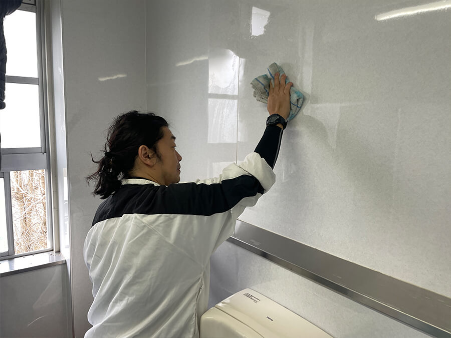 床を優しく磨き、拭き上げると、床の真っ青な青空のように美しくなったことに感動いたしました。