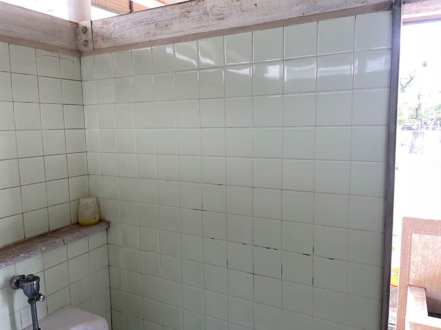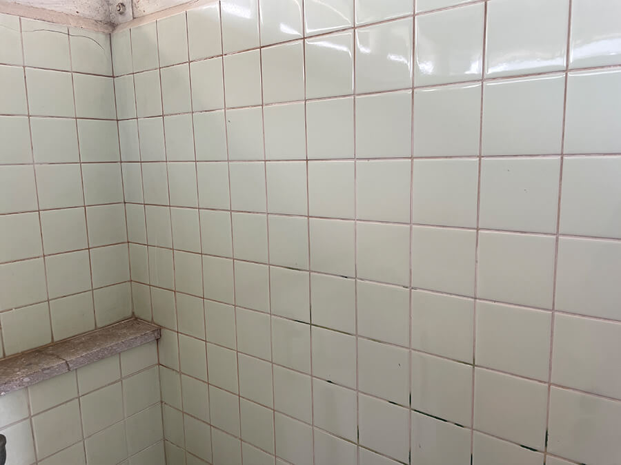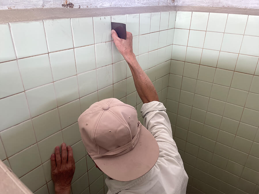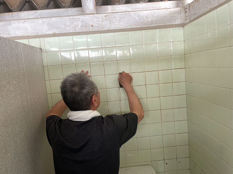 壁は目地の十時の箇所に汚れが溜まりやすく、また汚れが落ちにくく、皆熱心に取り掛かっていました。床の黒ずみはクエン酸と重曹を混ぜたものをかけ、少しの時間を置くことで、比較的汚れが落ちやすくなっているのではないかと感じました。