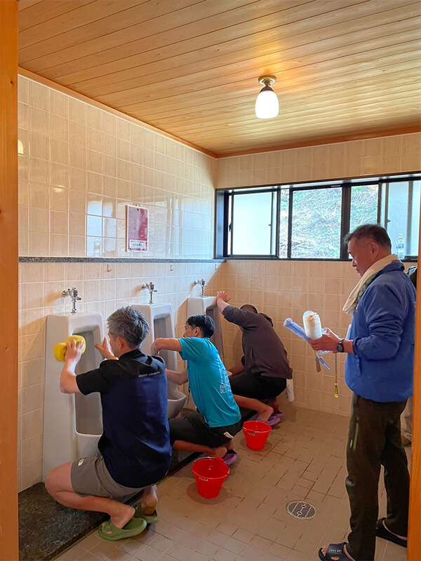 その後、「耕心の里」でトイレ清掃の実習を受け、掃除の意義や道具の使い方、考えて工夫することの意味など学ばせていただきました。