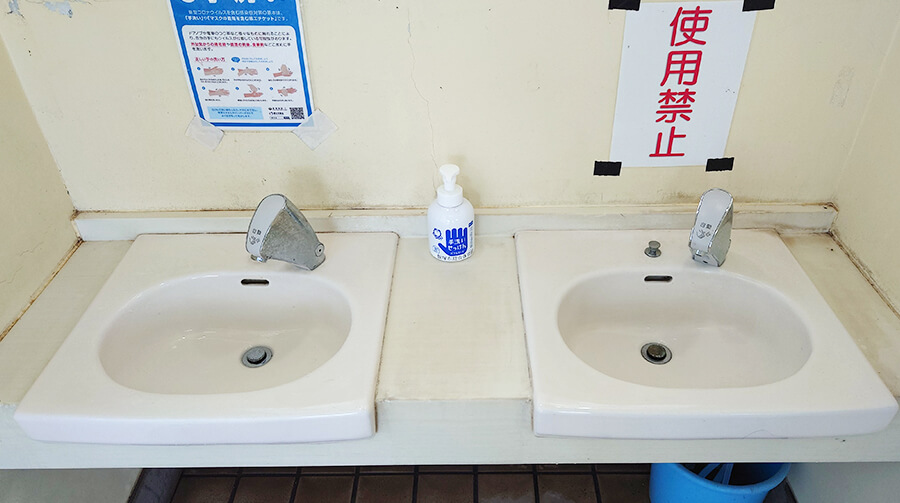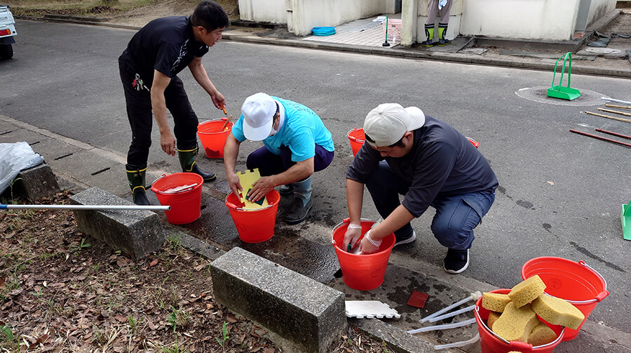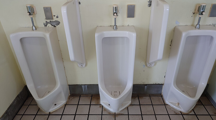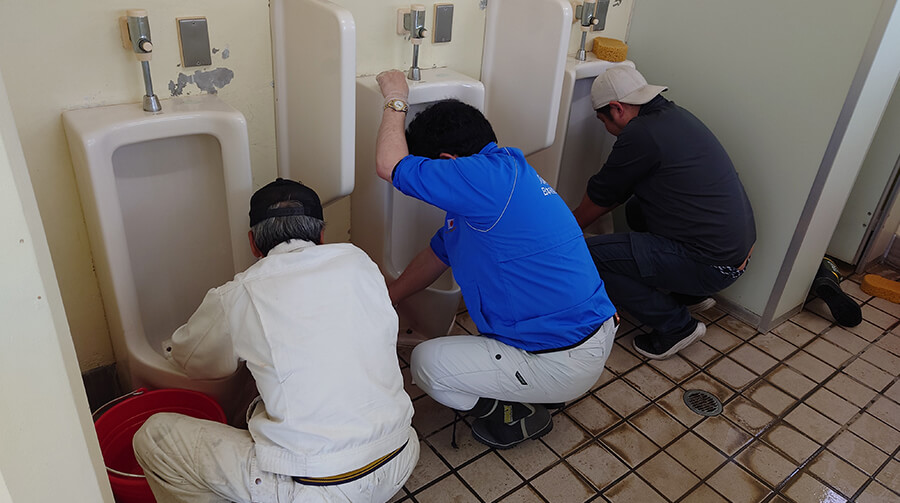 7ヶ月ぶりの掃除となりましたが、使用頻度が高いぶん男子トイレには尿石もこびり付いていました。今回はナイロンたわしでは落ちない状況でしたので、サンドメッシュとスクレーパーを使って除去しました。