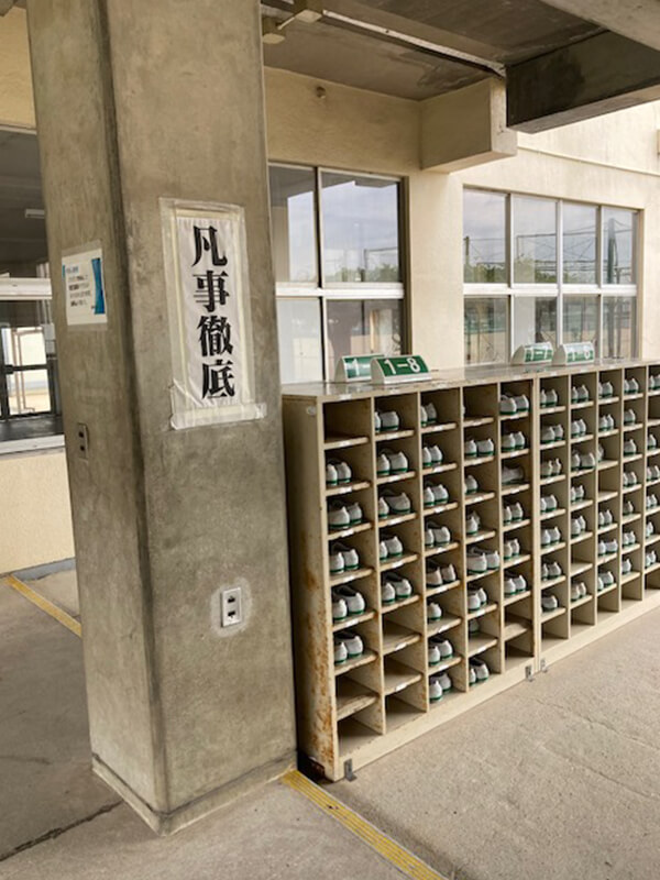 「凡事徹底」の標語と履物がきれいに揃えられた下駄箱、実に見事で気持ちいですね。