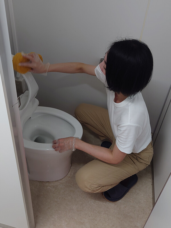 今回の定例会は、筑豊200回記念掃除に備えて、真新しい乾式トイレの掃除手順の確認のため、カネヨンやサンドメッシュなどの便器表面を傷めやすい道具を使わず、研磨剤無しのナイロンたわしとスペースショット洗剤を使って、便器と床磨き研修になりました。