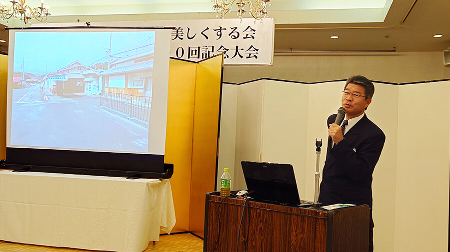 9/28(土)に飯塚市の“のがみプレジデントホテル”で行った記念式典は、土居代表世話人が司会進行。最初に筑豊掃除100回目以降の歩みの写真を動画風に編集したものをスクリーンに映し出すと、子供たちが笑顔で掃除する姿と一緒に自分も映し出される写真を、とても熱心に見ていただいた。