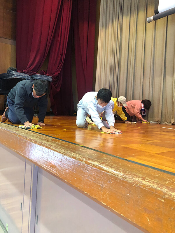 閑静な住宅街にある、大阪府立箕面東高校。体育館の舞台の床面、トイレを徹底掃除しました。