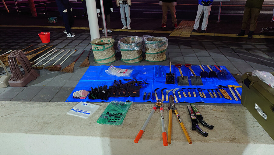 今日の日の出は7:24分。薄暗い中に照明を照らして、空気の冷たさに耐えながらごみを集めて、歩道や芝生内の落ち葉や土砂を丁寧に集めてゆきます。