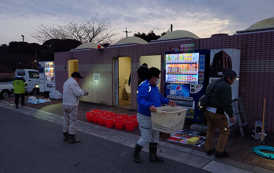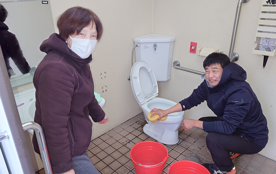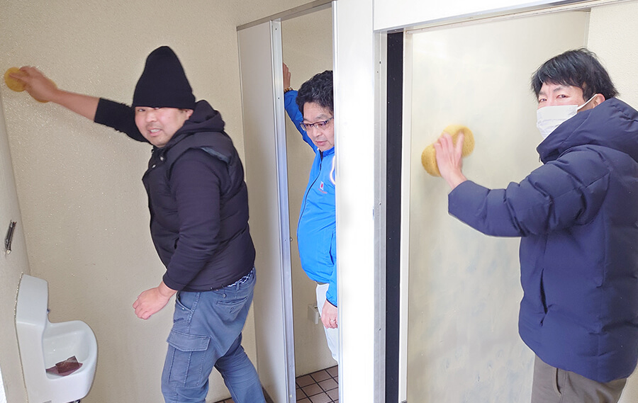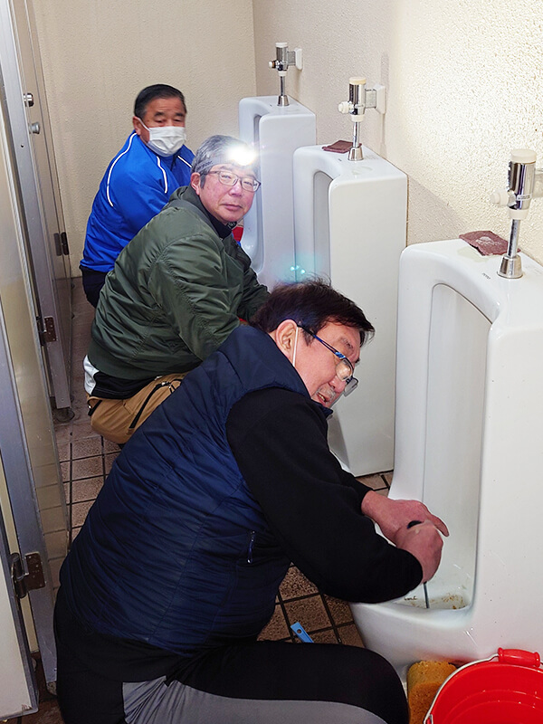 当日は寒さが厳しく外部水道が凍り付いていて慌てましたが、設備屋さんの土居代表がトイレ内の手洗い配管を分解して、掃除用の給水を確保してくれましたので、掃除ができるようになりました。お蔭さまです。