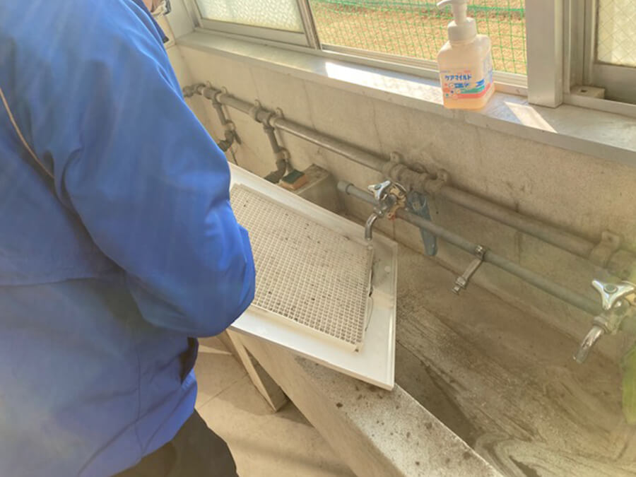 トイレ清掃の実践、いつもありがとうございます。汚いものを洗う際は衛生上、手洗い場ではなくSK(スロップシンク)などの洗い場がいいですね。