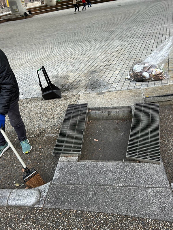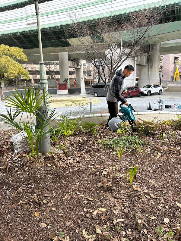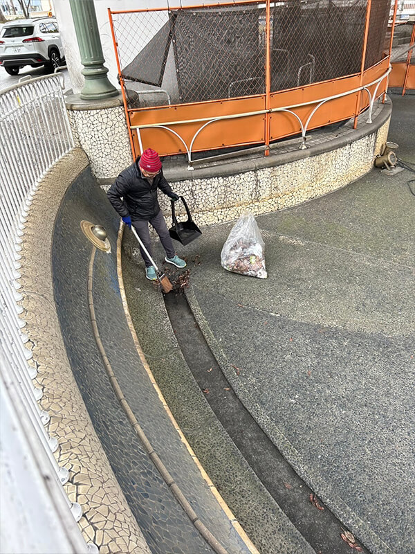 尿の匂いで気になっていた噴水の溝、落ち葉履き、回収した枝葉は細かく裁断し土に返す方法は、東京の菅刈公園の清掃を長年されていた阿部さん直伝です。