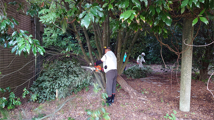 土居さんと村瀬先生と酒井先生が、草刈り機とチェーンソーなど、通常の掃除の会で使う道具を超えた職人用の器械を持ち込まれ、これまで身に着けてこられた技を果敢に披露して、雑木の伐採と枝打ち、草刈りに早速精を出されます。