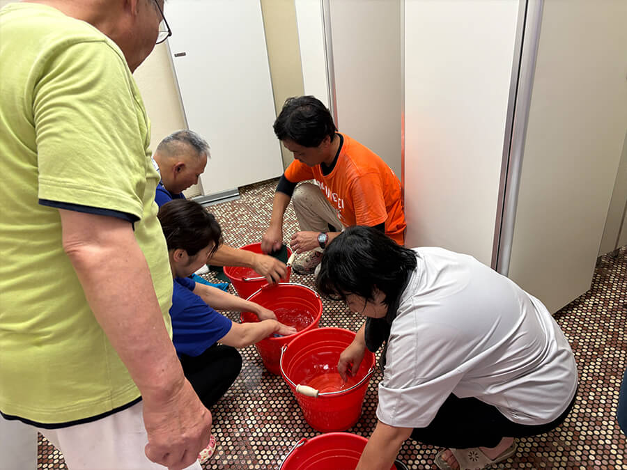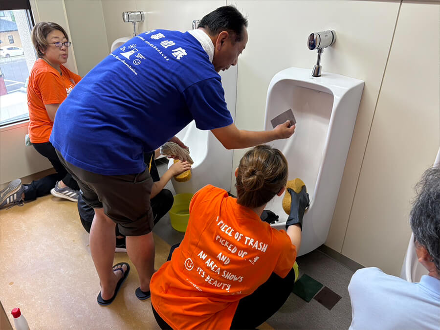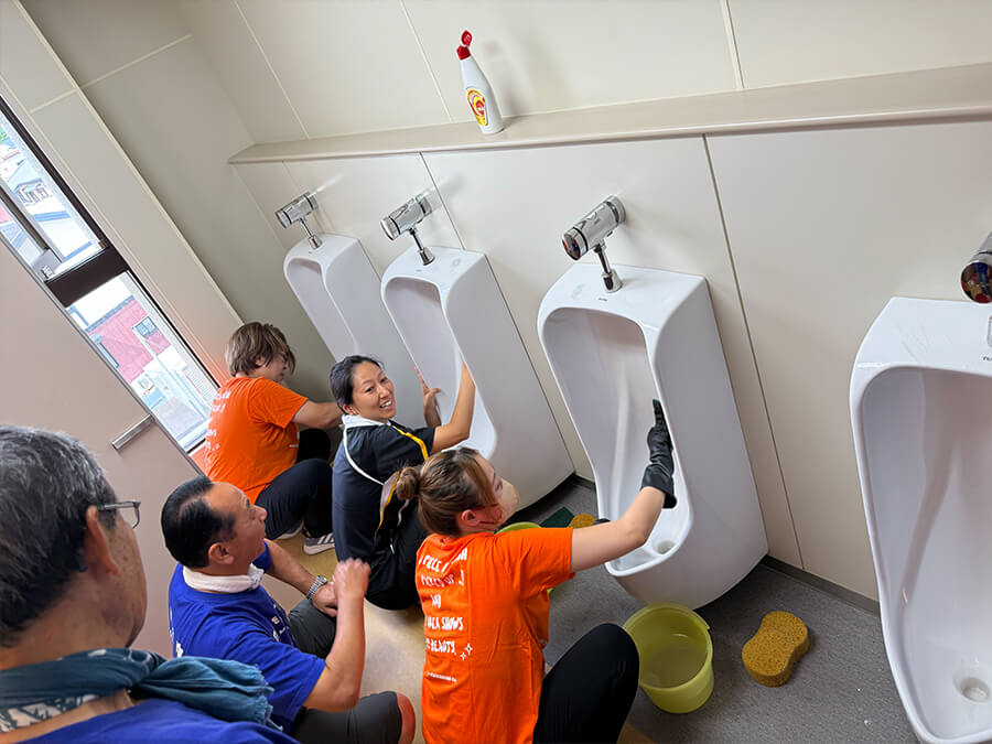 各班に分かれ、トイレを中心とした清掃に取り組みました。中でも「水漉し(みずこし)」担当班は、なかなか剥がれない尿石に2時間近く格闘する場面も。初参加の若手メンバーが「いい経験ができました」と語る姿には、“意味”を見出す姿勢がにじんでいました。