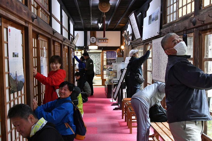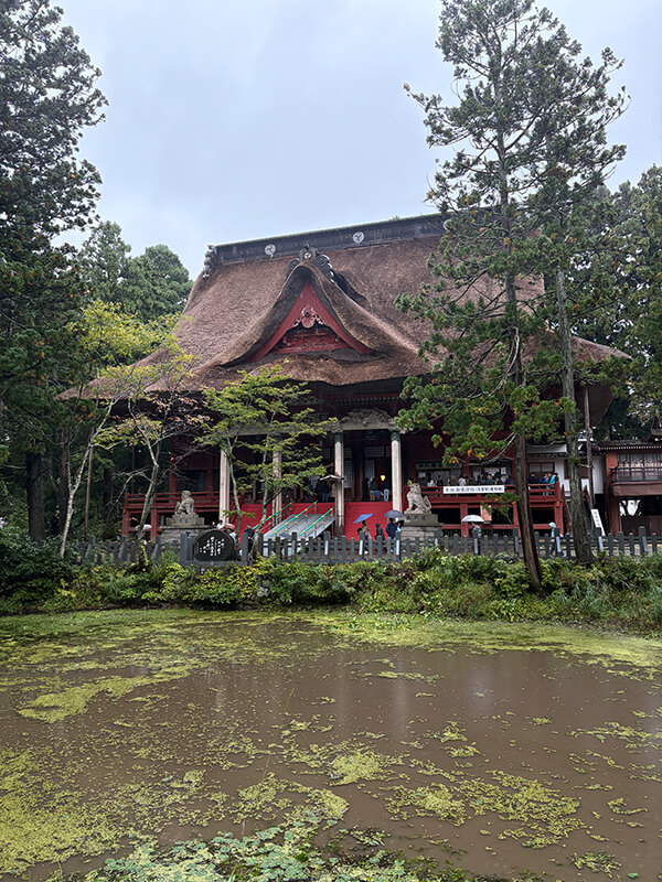 あいにく両日とも雨となりましたが、1日目は予定通り宮司様から出羽三山についての講話をお聞きし、その後、太々神楽の奉納と会食を行うことができました。2日目は屋外での掃除が難しい状況となり、実行委員長の馬場さんや冨田会長、田中義人相談役のご助言のもと、田中相談役の講話後に「斎館(さいかん)」という宿泊施設の清掃を行いました。