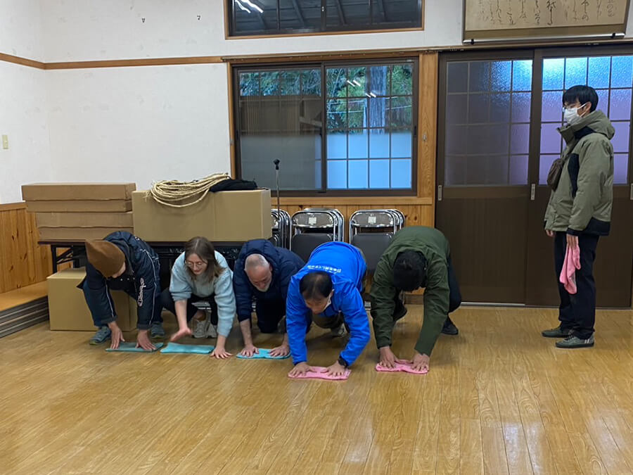 参集殿では、広い床を雑巾で拭き上げる作業を行い、床面をきれいに整えていきました。