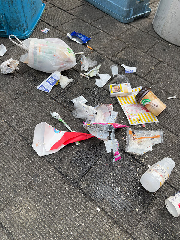 以前は捨て方が荒かったですが、今はこのように決められた場所にまとめて置いてくれる様になりました。