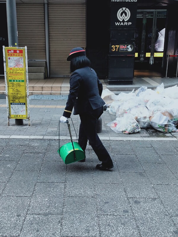 箒で掃いている背景に見えるのは、昨晩店舗から出たゴミの山です。