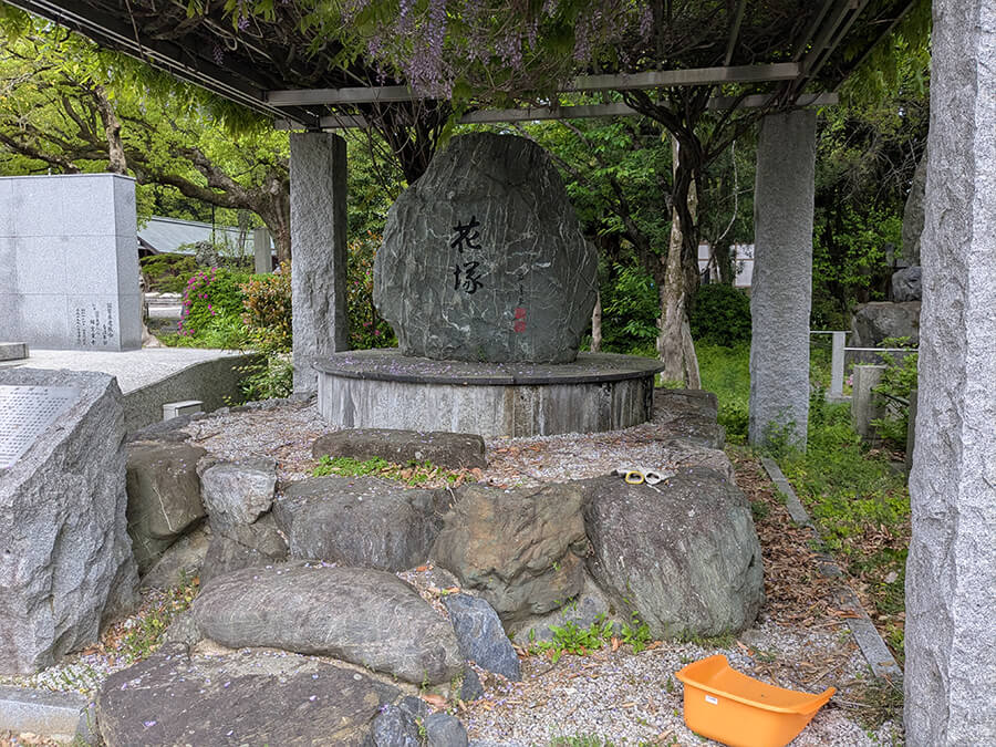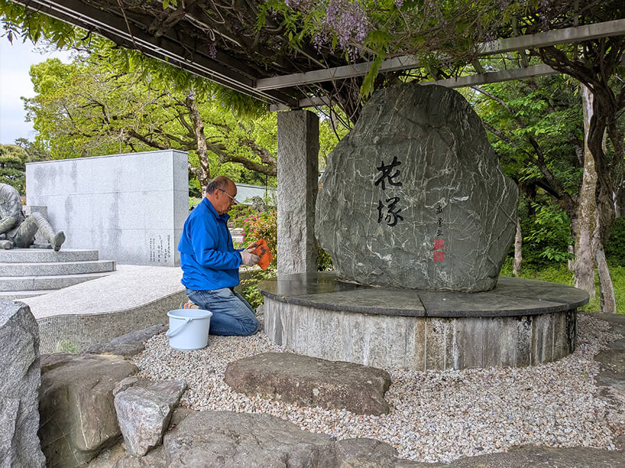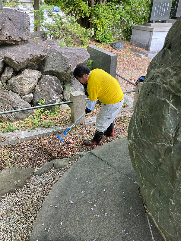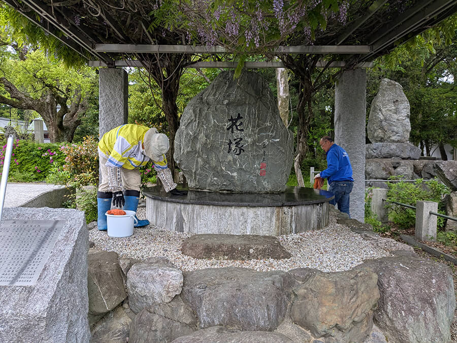 今回は、花塚のお掃除をさせて頂きました。落ち葉拾いから始まって周辺の草むしり・台座の水拭きとさせて頂き、見違えるほど綺麗にさせて頂けました。