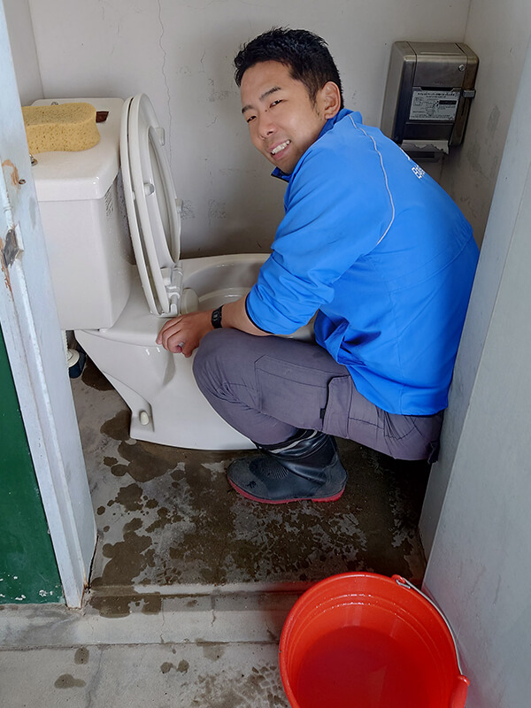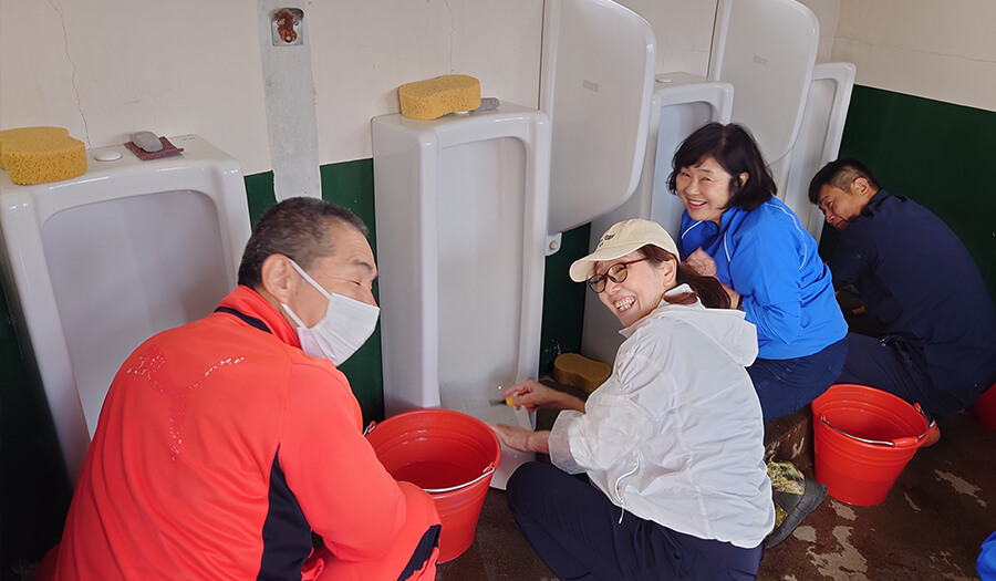 2年振りとなる注水のない男子トイレの汚れはすごく、しり込みしそうになりましたが、福岡からの川口さん、池田さん、永井さん、中尾先生が、サンドメッシュと軽石とスクレーパーを使って気合を入れて尿石を落としてくださったお蔭で、40分後にはピカピカになりました。