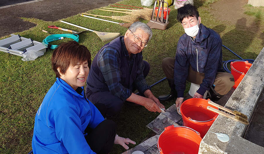 来た人から銘々に、トイレ周りの草取と草刈りに取りかかってくれます。あっという間に入り口前の雑草や縁石沿いのペンペン草も綺麗に無くなり、心を落ち着けてからトイレ掃除開始となりました。