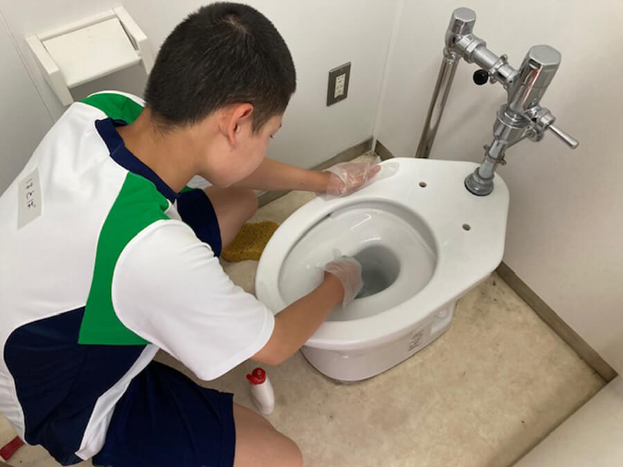 今回は、野球部の1年生を中心に、20名の生徒さんも参加、総勢32名で2階と4階のトイレをお掃除しました。