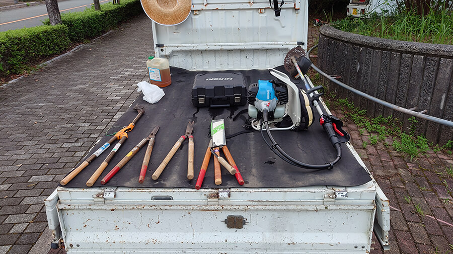土居さんと村瀬先生と酒井先生が、草刈り機とチェーンソーなど、通常の掃除の会で使う道具を超えた職人用の器械を持ち込まれ、これまで身に着けてこられた技を果敢に披露して、雑木の伐採と枝打ち、草刈りに早速精を出されます。