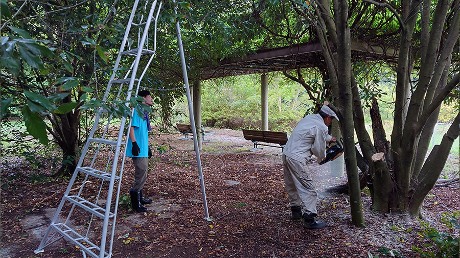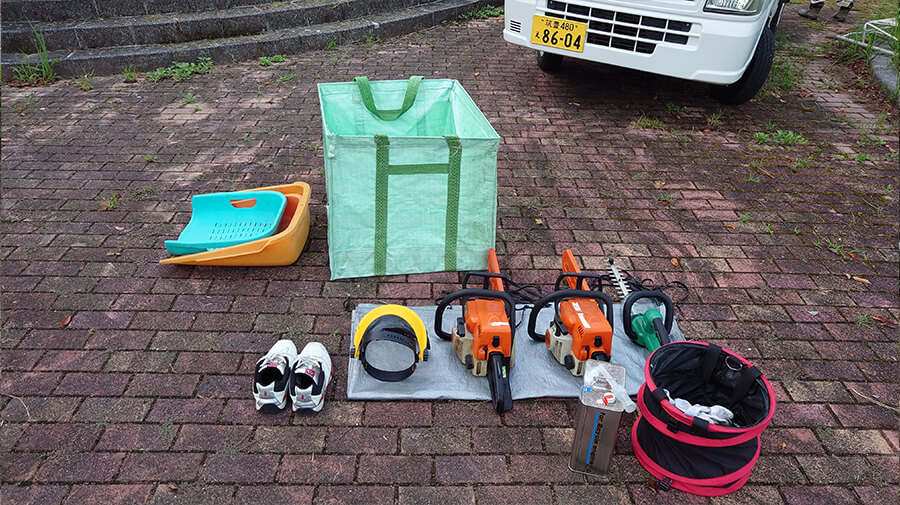 長年放置された広場ですので、木々にはカズラが巻き付いていて、刈った枝を取り除くにも労力と時間がかかります。