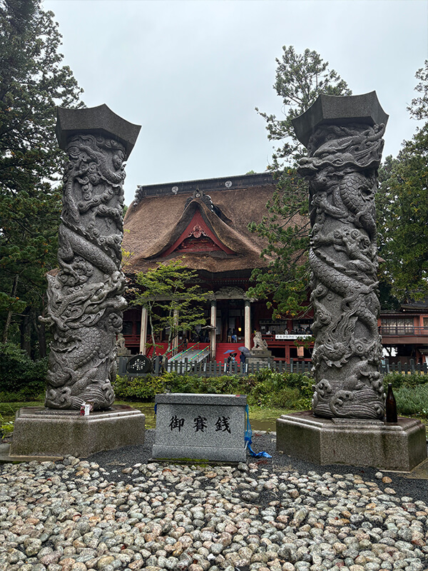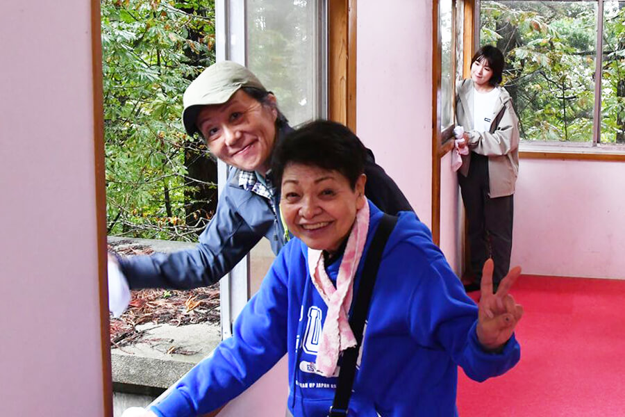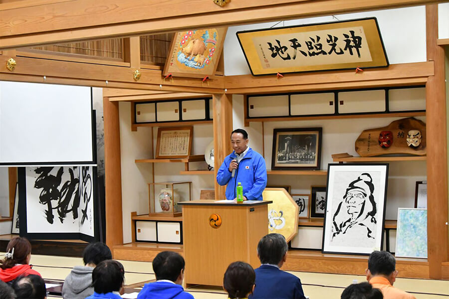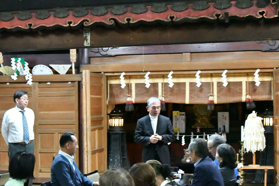 あいにく両日とも雨となりましたが、1日目は予定通り宮司様から出羽三山についての講話をお聞きし、その後、太々神楽の奉納と会食を行うことができました。2日目は屋外での掃除が難しい状況となり、実行委員長の馬場さんや冨田会長、田中義人相談役のご助言のもと、田中相談役の講話後に「斎館(さいかん)」という宿泊施設の清掃を行いました。