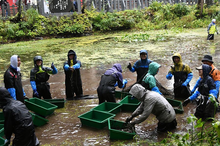 当日、鏡池前での演奏を予定していた八乙女太鼓の皆さんには、本殿で演奏していただき、普段はなかなかできない正式参拝や厄払いの機会にも恵まれました。さらに、「どうしても池の掃除をしたい」と志願した約30名の“決死隊”の皆さんが、泥まみれになりながら鏡池に入り水草を取り除き、その様子は夕方のニュースでも紹介されました。