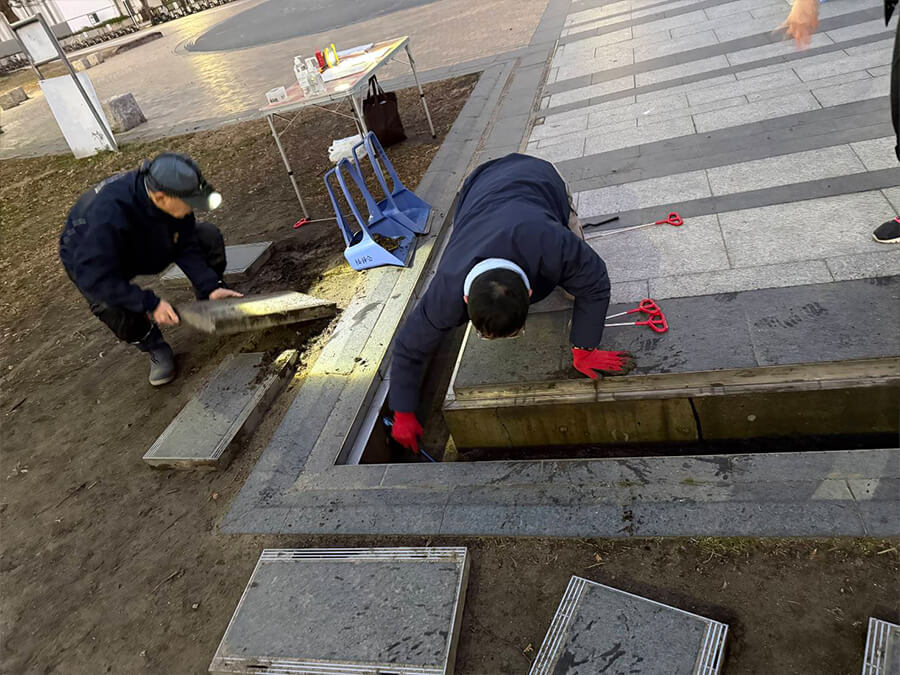 グレーチング班は重たいグレーチングを次々と持ち上げ、黙々と中の泥を回収していました。