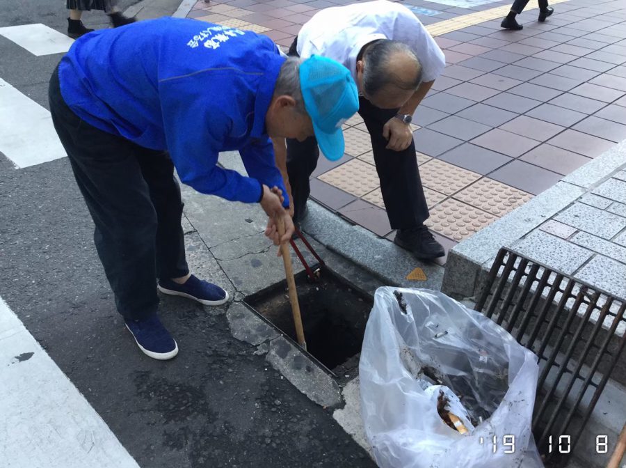 掃除道具の管理やゴミ処理は、当初八仙閣が行っていたが、2011年(平成23)冨吉さんが引き継いだ。トング(小)100本、(大)30本、庭園箒30本、ちり取り10個、グレーチング清掃セットなどを、前日軽トラに積込み、8日の5時40分頃搬入して設営、終了後の水洗い、天日干し、保管を行う。ゴミは、役所との長い交渉の末博多区環境課に引き取ってもらっている。回収量は、90㍑袋で可燃2~3袋、空缶など1~2袋と、以前よりかなり減った。街がキレイになった証だ。