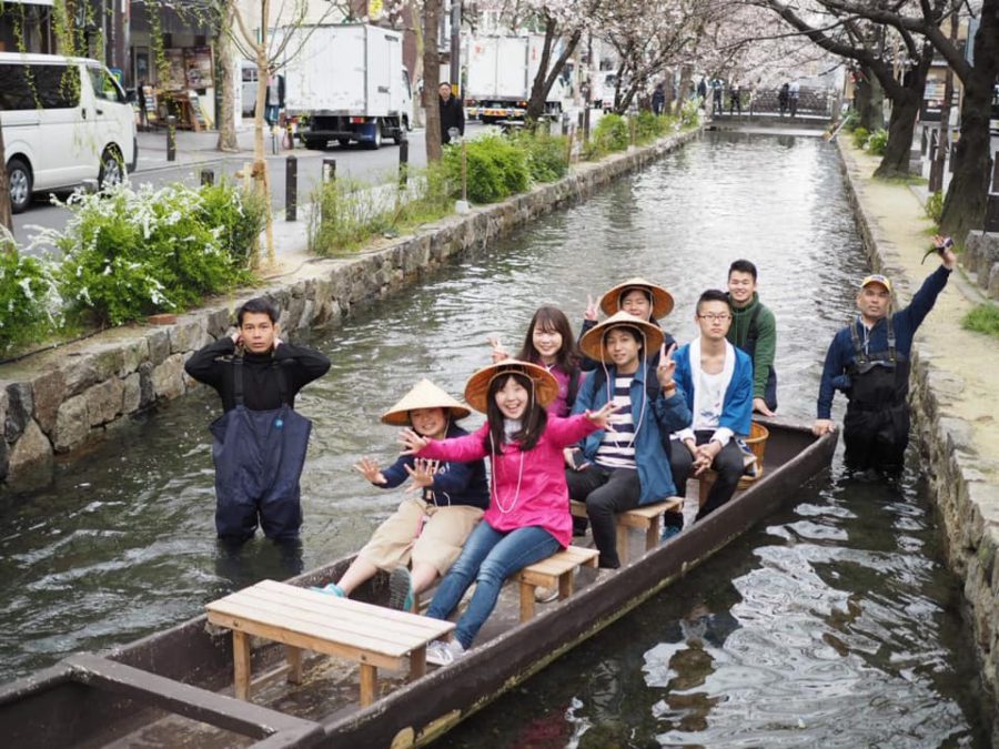 そして、地域の桜祭り(写真)のイベントの一つとして、新洗組に高瀬舟を曳いてもらいたいとの相談がありました。歴史ある高瀬川・高瀬舟を保存する取り組みです。私たちは、「はい、喜んで!」と多くの学生たちと参加し、新しい出逢いもたくさんありました。桜の舞い散る高瀬川。忘れられない青春の思い出です。