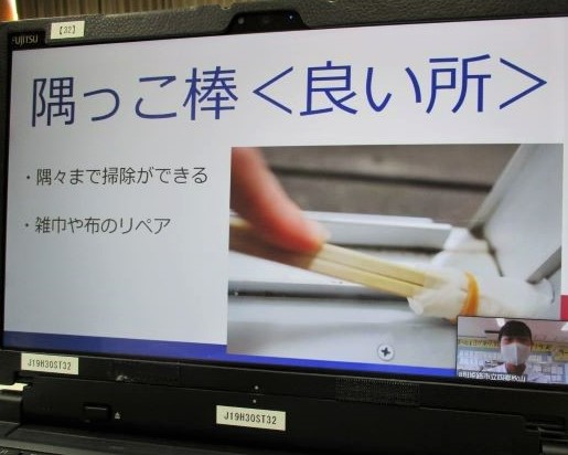 ○常盤中では私語が減らず、清掃の意識が低いので、他校に学ぶことが多くありました。委員が赤い手ぬぐいをかぶって率先する箕輪中や、四郷学院の隅っこ棒(写真)など、工夫や伝統を大切にしていて、とてもよいと思いました。オリジナルな工夫をすると意識も高まると思いました。