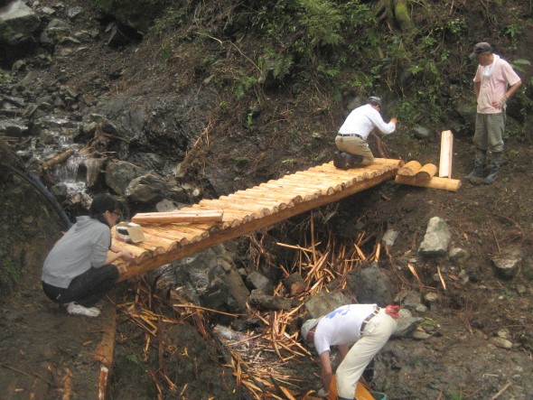 岩や土砂を撤去して道をつけ、丸太を切って谷に橋をかけることにした。村の人は「7日はかかる。素人には無理だ」と言ったが、彼らは夕方までにやりとげた。村の人に大いに喜ばれ、この道は「なかよしロード」と名付けられた。
