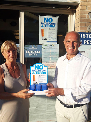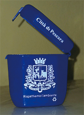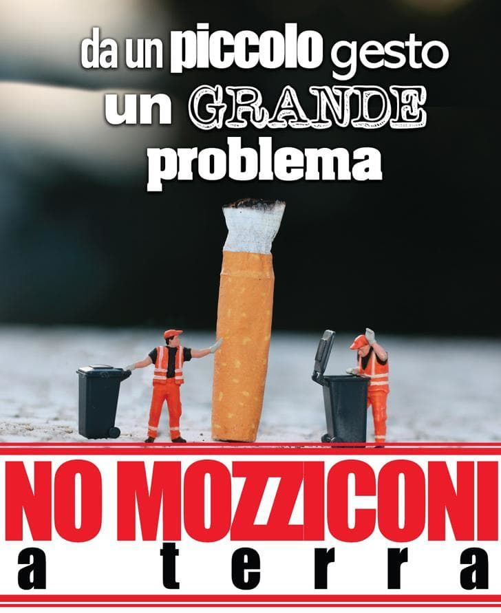 2020年は、イタリアのすべての市長が参加するテレビ番組に、ペスカーラ市長カルロ・マシが応じ、市内全域で路上灰皿の数を増やすことにしました。既存の灰皿に加え、約千箇所に灰皿が追加設置されました。同時に、ポケット灰皿進呈付き「NO MOZZICONI A TERRA地面に吸殻禁止」キャンペーンにより、ペスカーラ海岸のすべてのショップや海水浴施設に、約5千個のポケット灰皿(写真右)を無料配布し、町中に多くのポスター(写真左)を掲示しました。