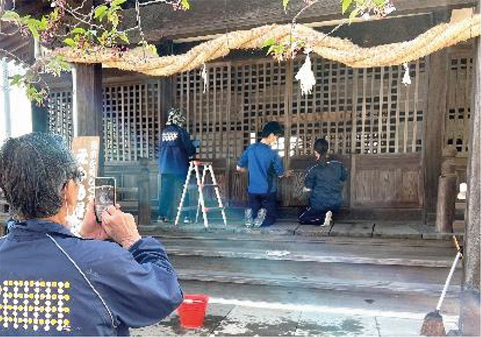 ゴミ拾い・草取りに加え、顧問の指導で拝殿の拭き掃除も行った。木造の建物は大変古く、雑巾がすぐに黒くなり洗って拭いてを何度もくり返した。離れて見ると、空気が変わっているのを感じました。