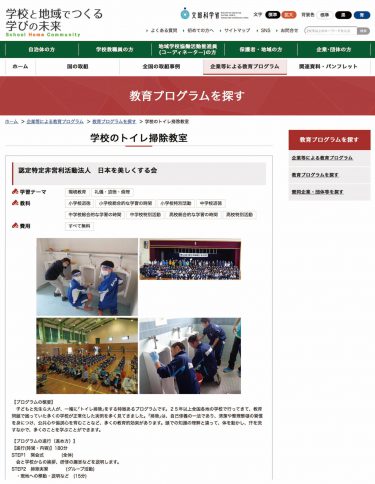 理事 縄田 良作 子どもと先生ら大人が、一緒に「トイレ掃除」をする特徴ある教育プログラムです。日本を美しくする会は、25年以上前から全国各地の学校で行ってきて、教育問題で困っていた学校が正常化した実例を多く見てきました。 「掃除」は、自己修養ととも […]