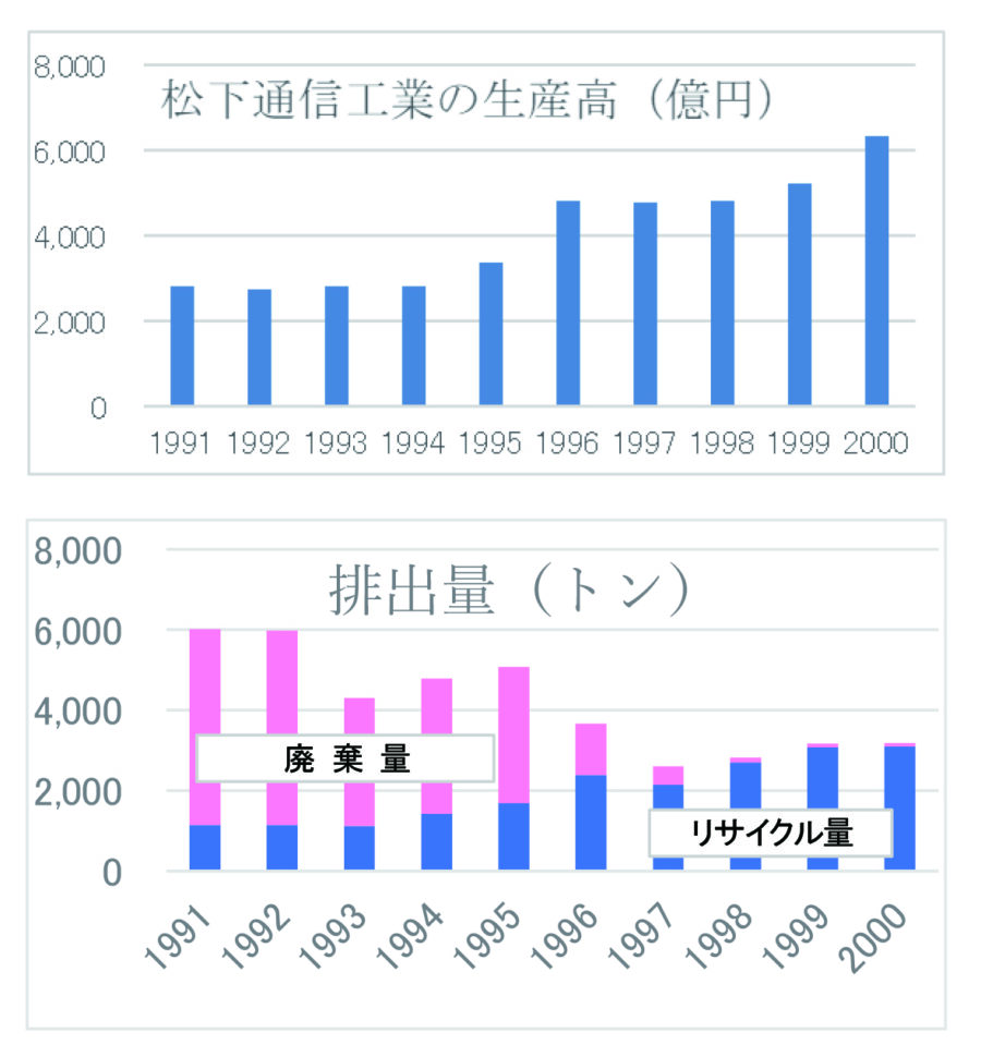 第一 それまでほとんど皆無だった、松下通信工業の排出物リサイクル率が99%になりました。つまり、排出物の99%が資源化されて、文字どおりの「ゴミ」が1%にまで減ったのです。