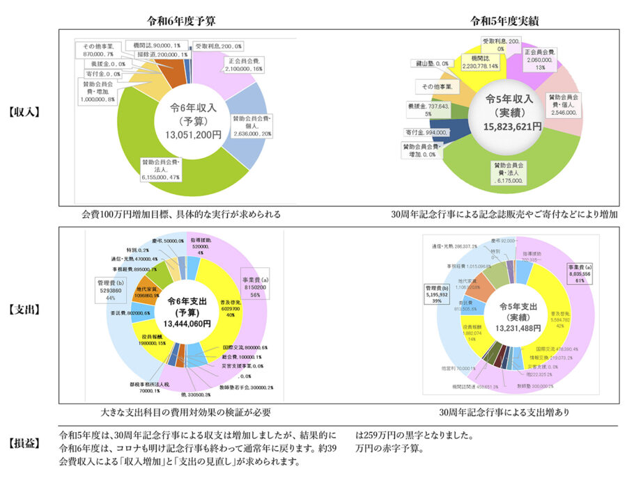 ホームページの、「団体概要」−「予算と実績」をご覧ください。